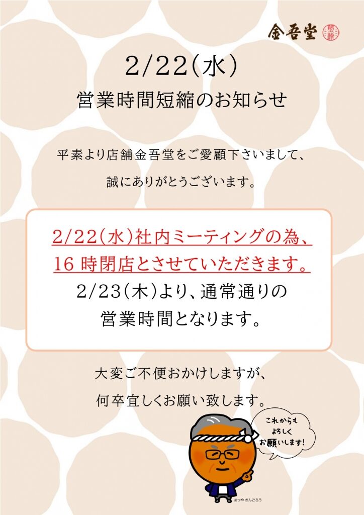 ●営業時間短縮の日 2/22(水)は社内ミーティングの為16時閉店とさせていただきます。 ご不便おかけしますが何卒よろしくお願いいたします。