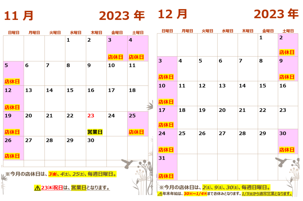 ※11.12月の営業日・休業日は、下記の通りとなります。